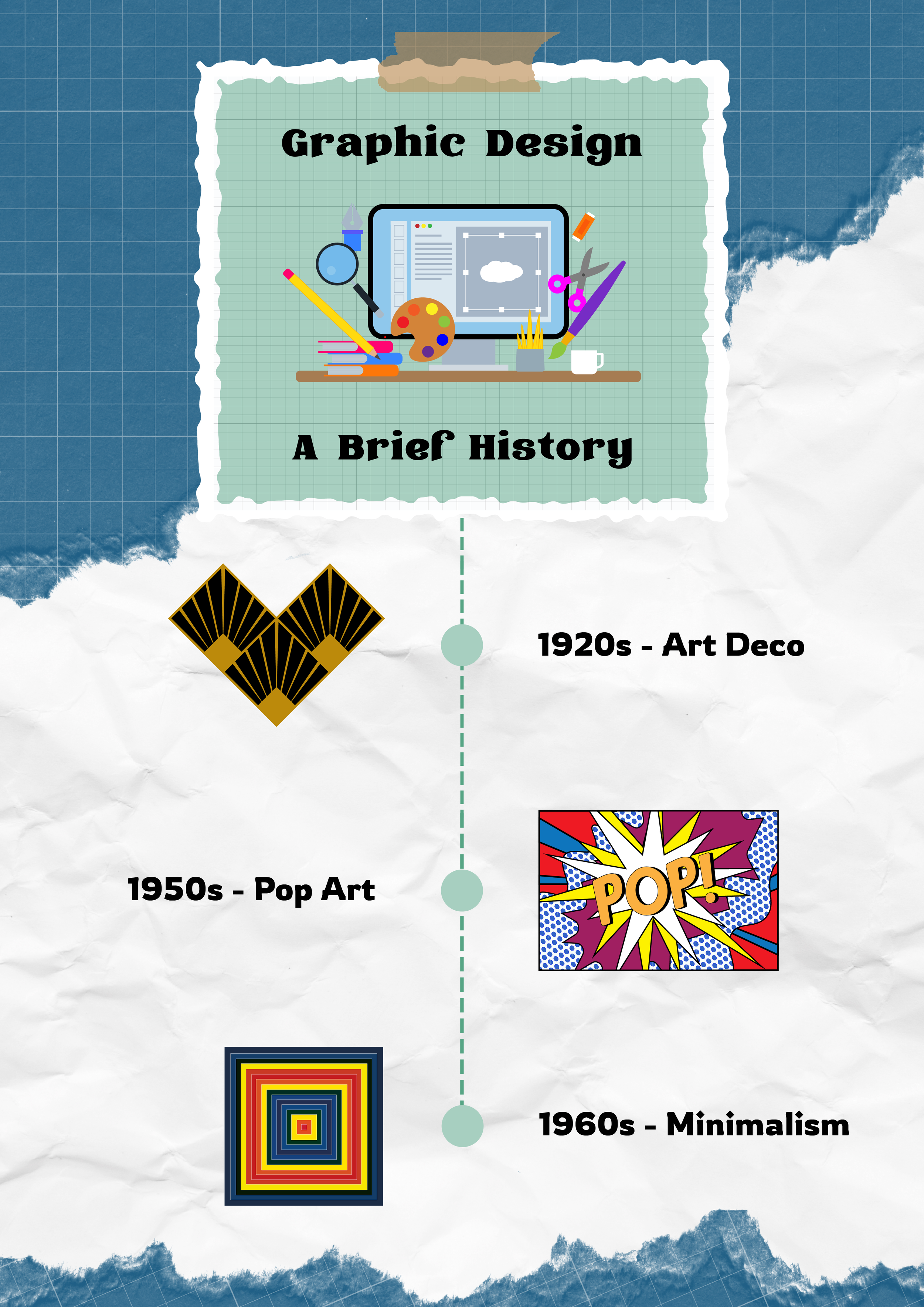 For this assignment, I was tasked with creating an A3 infographic poster for a classroom wall titled “Graphic Design – A Brief History.” The goal was to visually communicate three major design movements across different decades using minimal text and strong visual cues.
